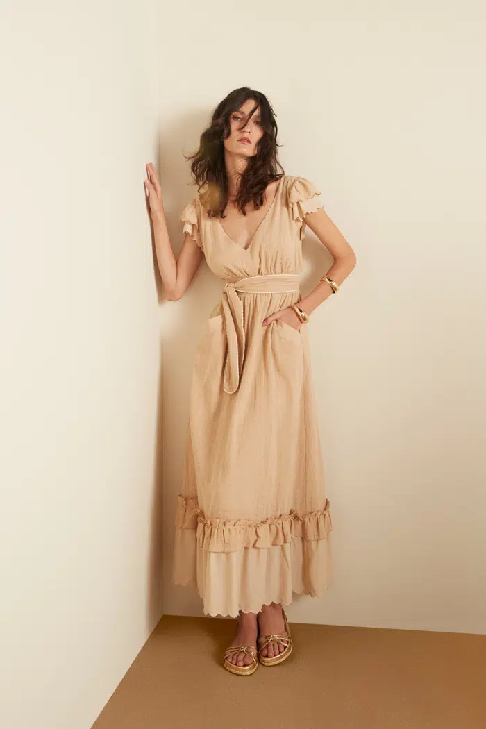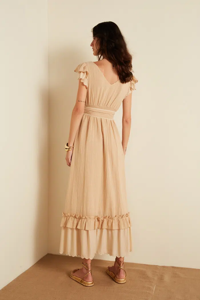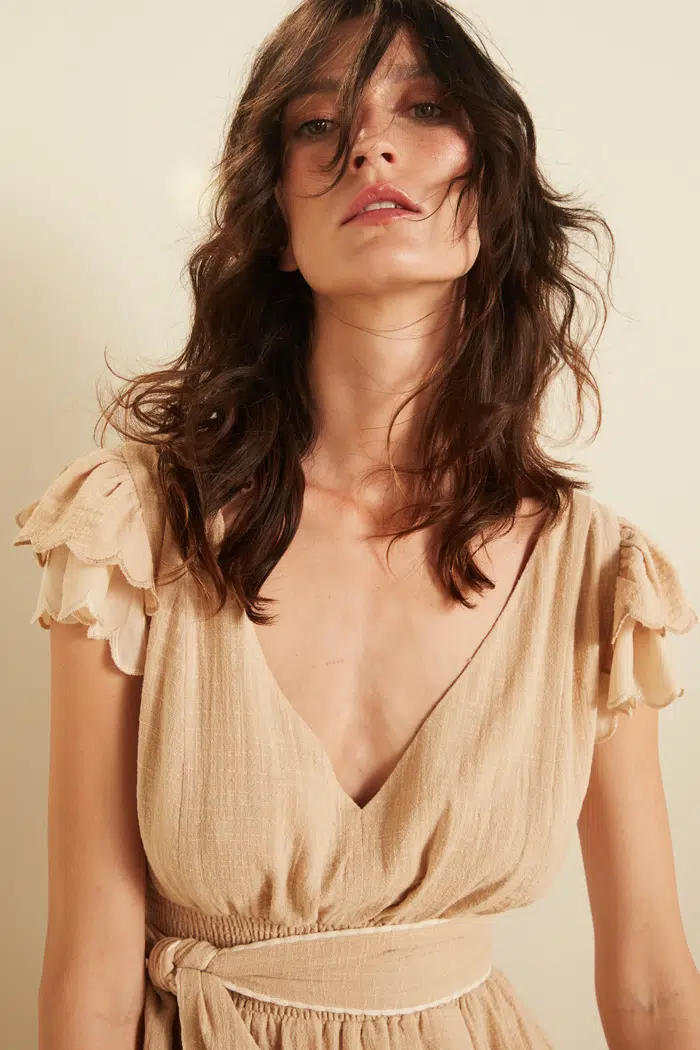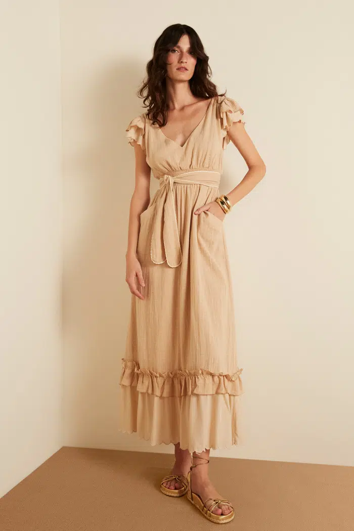 Vestido Midi com Babado na Manga – Areia. Este vestido com detalhes em babados foi pensado para uma mulher romântica e super feminina. Com os acessórios certos você pode transformar o seu look de acordo com o mood do seu dia! A cor areia é super versátil e combina com tudo.